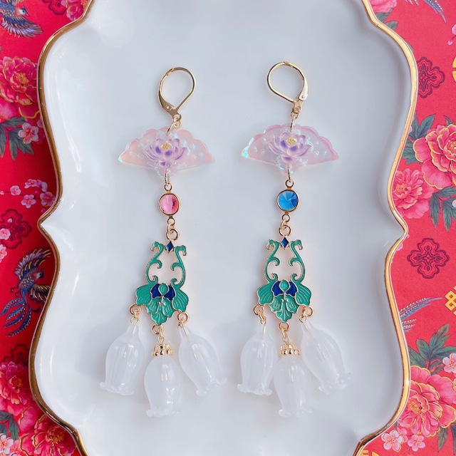 ご購入前に必ず https://gruidae207.base.shop/items/97360183 をご一読下さい。 オーロラの扇子、金魚の尾びれみたいなコネクターとカンパニュラ風のお花ビーズが揺れる耳飾り。 ピンクとブルーのストーンはヴィンテージスワロフスキーを使用しています 和装やチャイナファッションにもおすすめです。シノワズリ好きさんにもぜひ ◯ サンプル写真ではフレンチフックピアスを使用していますが、イヤリング等へのパーツの変更ができますのでお選び下さい。 金属アレルギー対応のものもご用意しております。 ひとつの重さ:約7g