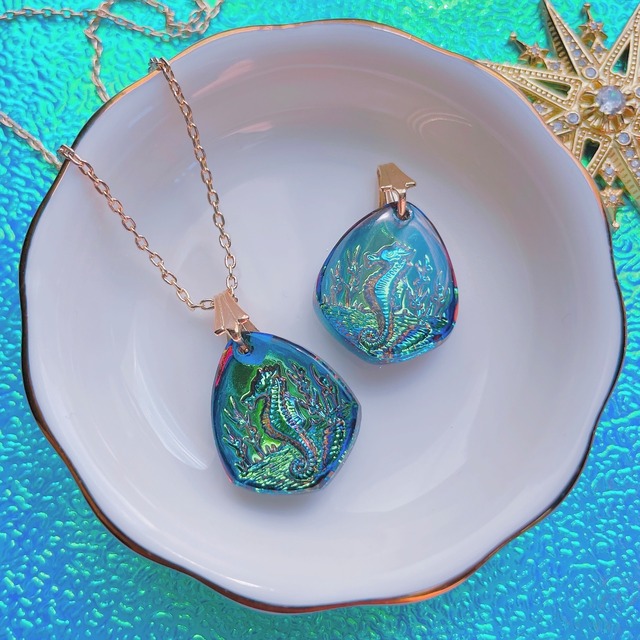 ご購入前に必ず https://gruidae207.base.shop/items/97360183 をご一読下さい。 タツノオトシゴと海底が描かれた インタリオのネックレス。 インタリオは1970年代のドイツ製。 バミューダブルーというカラーで、 角度や光の当たり方によって色の変化を たのしめます。深い海のようなカラーリングで モチーフにぴったりです ◯ 裏面がシルバーだったり白だったりの インタリオが多いのですが、こちらは 裏までカラフルなタイプでかわいいです☺︎ チェーンをお選びいただけます。 全てアジャスター付きです。 チェーン込みの重さ:約4g 別売りで、金属アレルギー対応の サージカルステンレスチェーンもございます。 ご希望の方はこちらをカートにお入れください☟ https://gruidae207.base.shop/items/70767620 #水族館 #夏 #魚 #青 #ヴィンテージ #ビンテージ #ガラス
