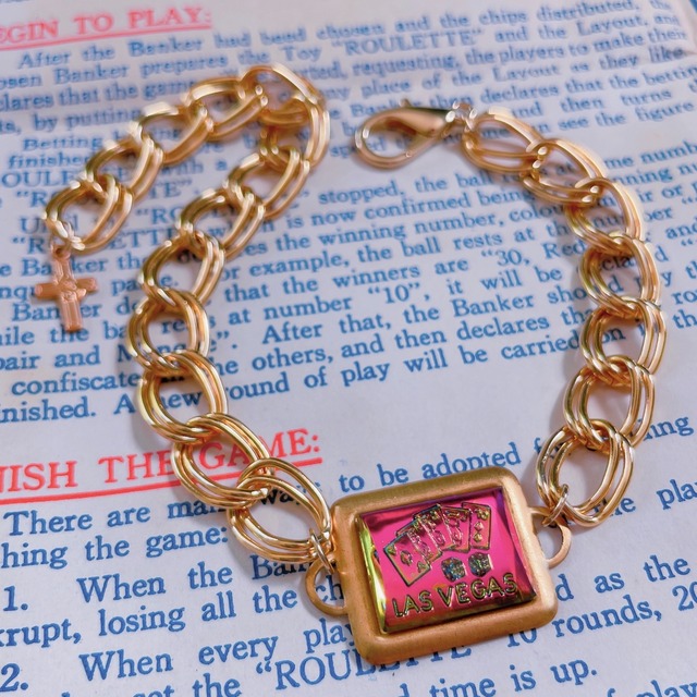 ご購入前に必ず https://gruidae207.base.shop/items/97360183 をご一読下さい。 LAS VEGASの文字とトランプ、 サイコロが描かれた珍しいインタリオを 太めのチェーンとあわせて、シンプルながら 存在感あるブレスレットに仕立てました。 チェーンの先のクロスのチャームもポイントです。 インタリオは正面から見るとピンクですが、 角度によってオレンジや グリーンなどのカラーが楽しめます。 大きめのカニカンで 着脱とサイズ調節が簡単にできます◯ カニカンの先からチェーンの端まで:約23cm あまり見ない特殊サイズのインタリオなのですがちょうどぴったりのセッティングがあったので嬉しかったです…!