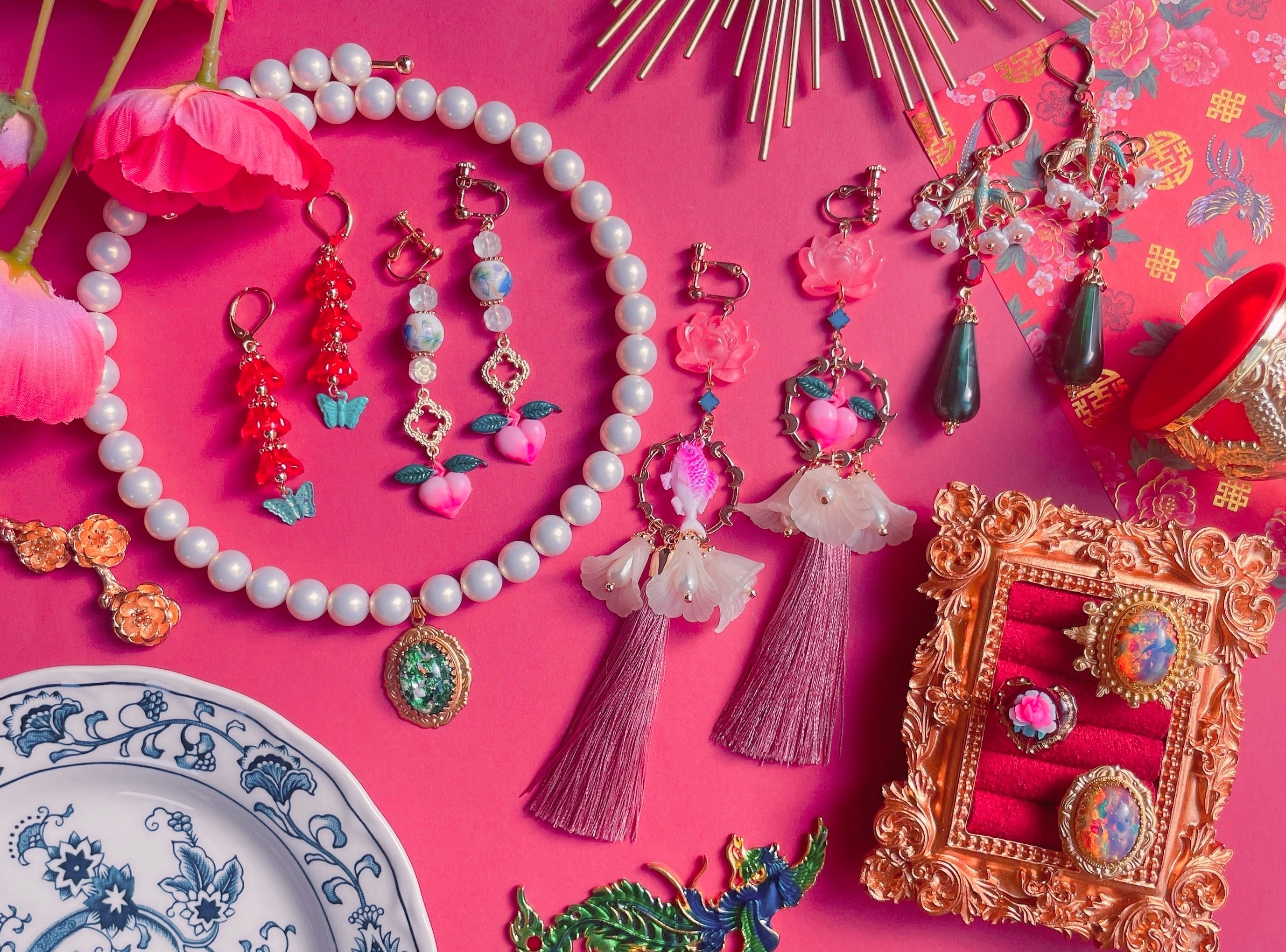 モチーフたちのアシンメトリーの大ぶり耳飾り。