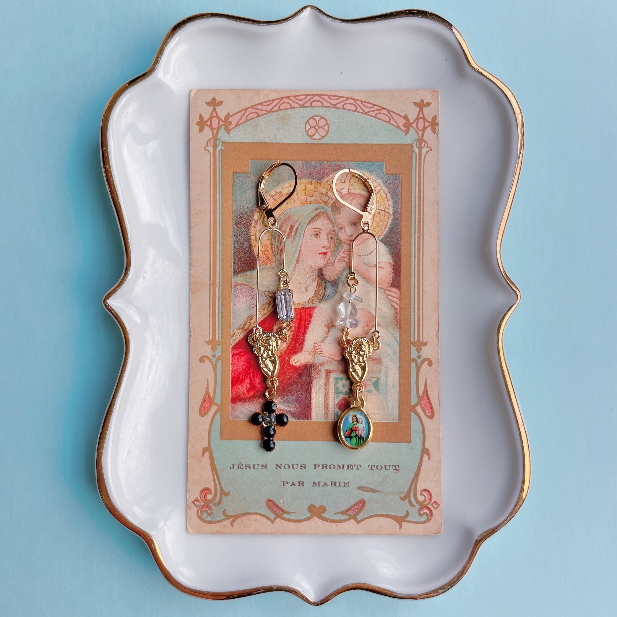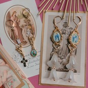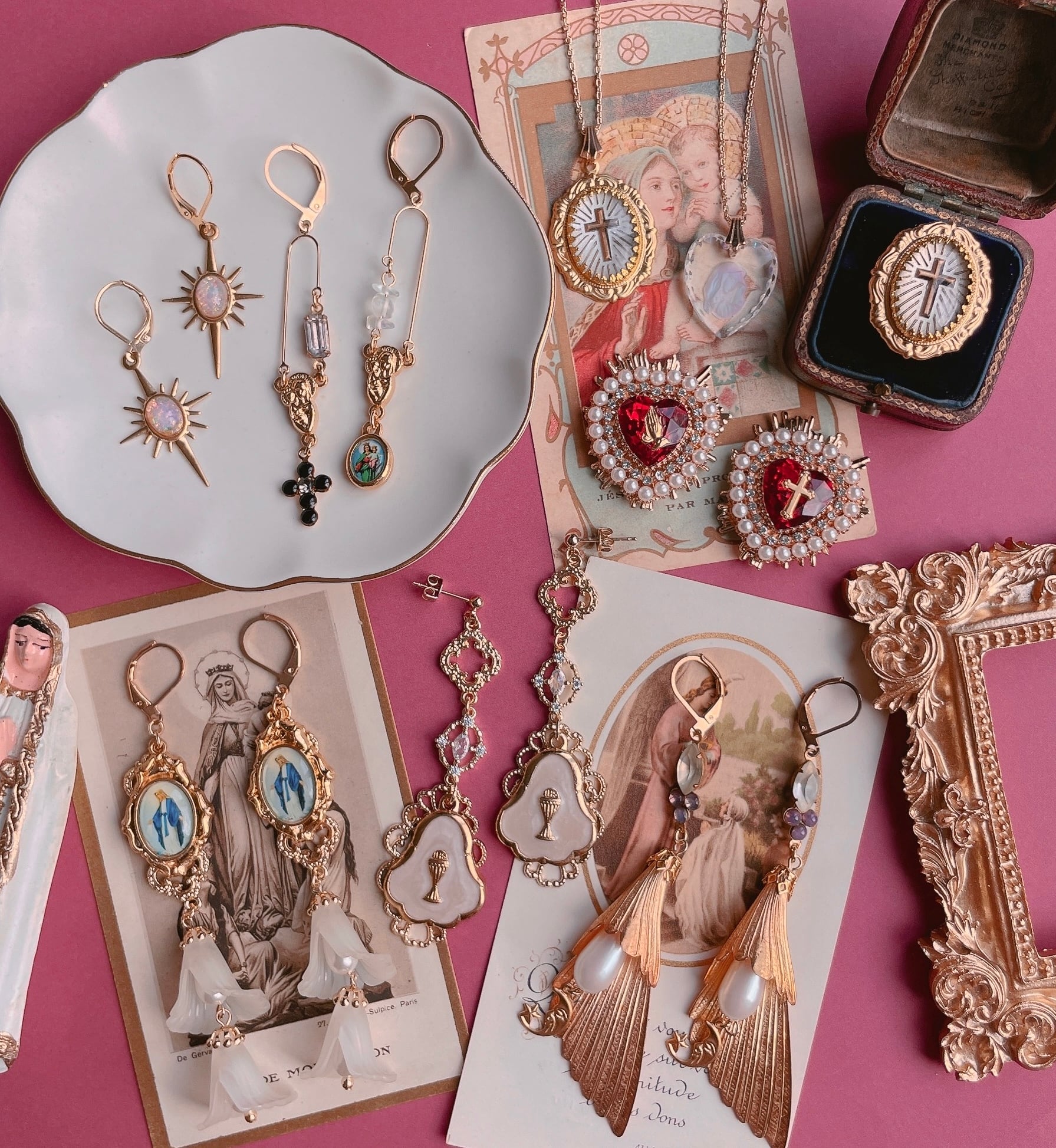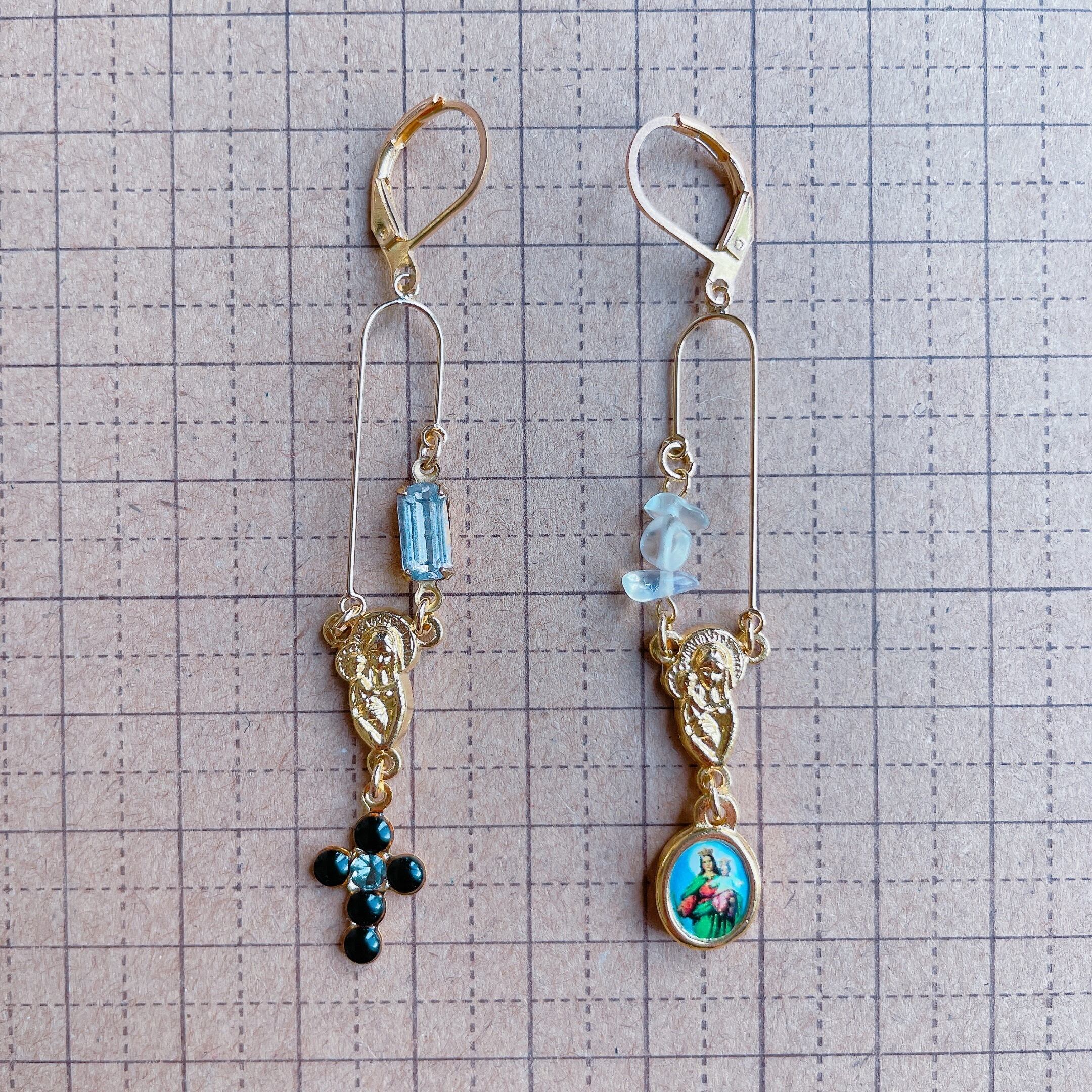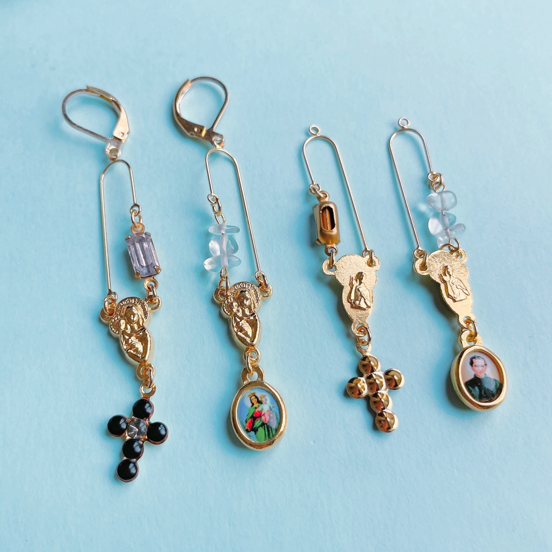 メダイやクロスがゆれるアシンメトリーの耳飾り。