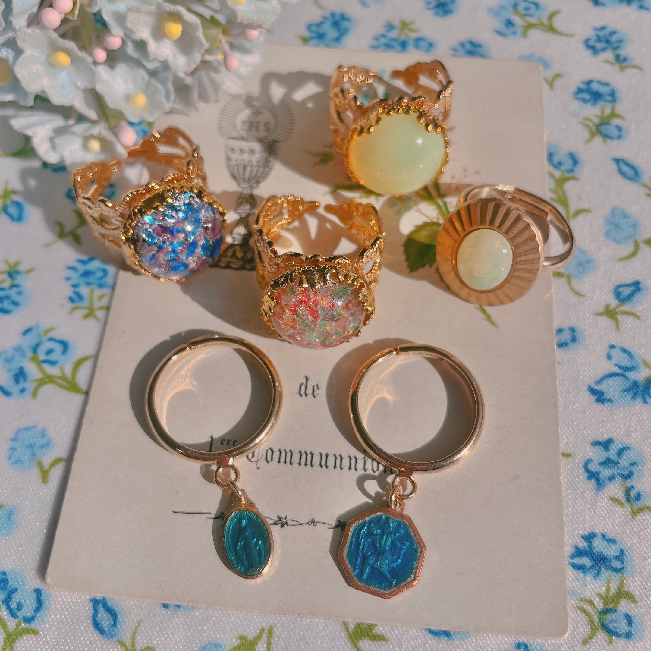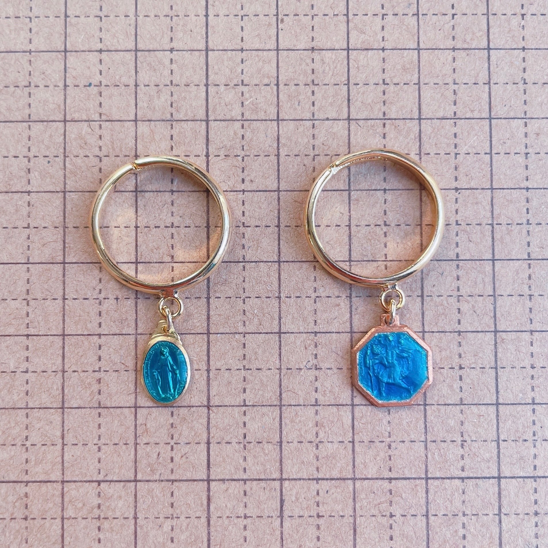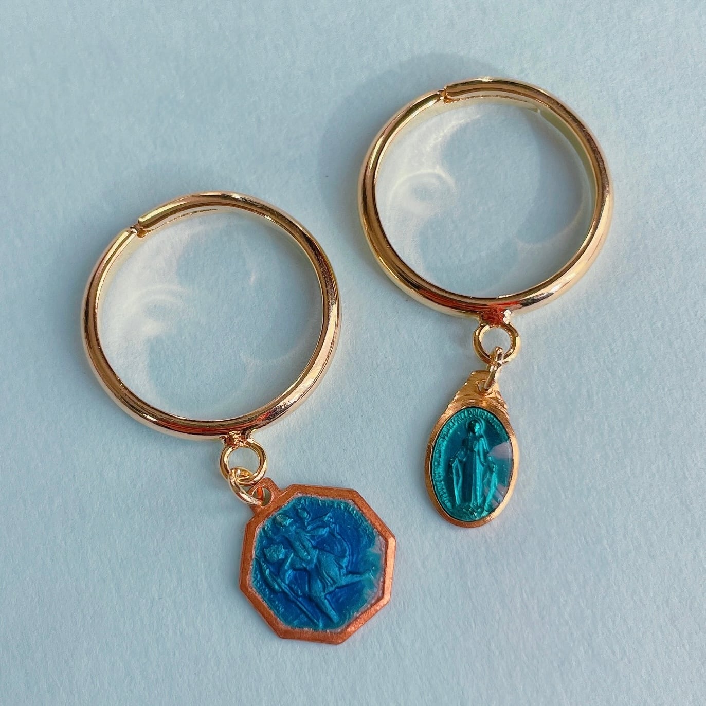 ブルーのエナメルで色付けされたメダイの指輪。