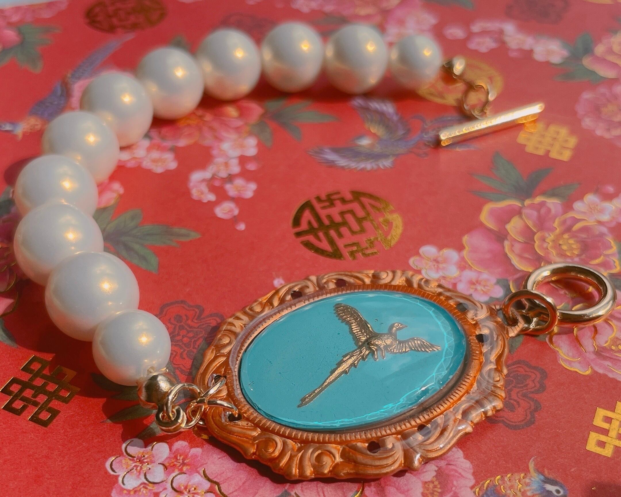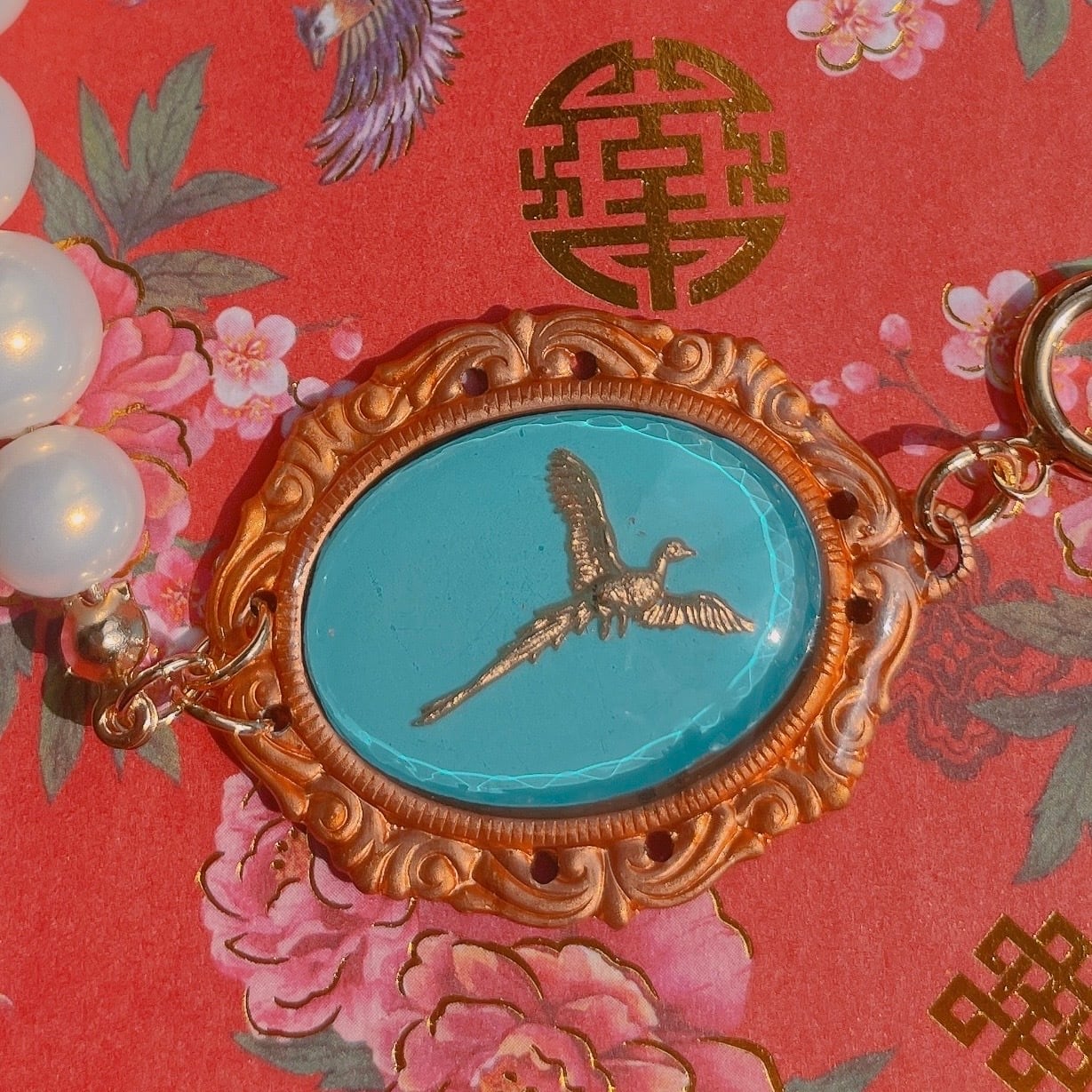 あざやかなエメラルドブルーに黄金の雉が描かれた