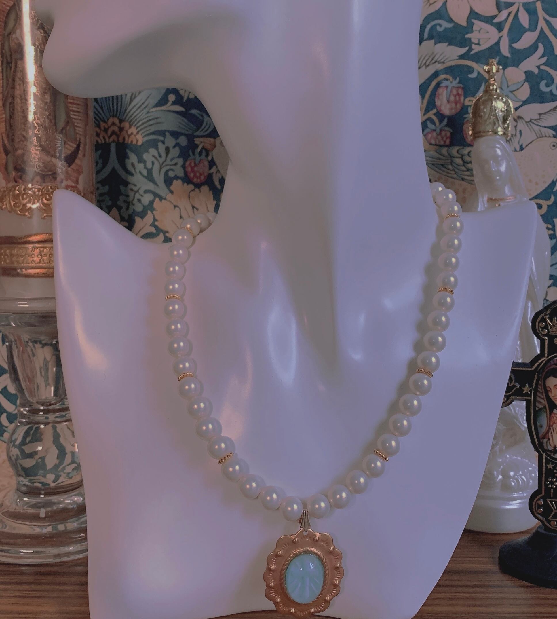 エレガントなムーンストーン風のインタリオ×アメリカから取り寄せた個性的な真鍮セッティング×パールの華やかなチョーカー/ネックレスです