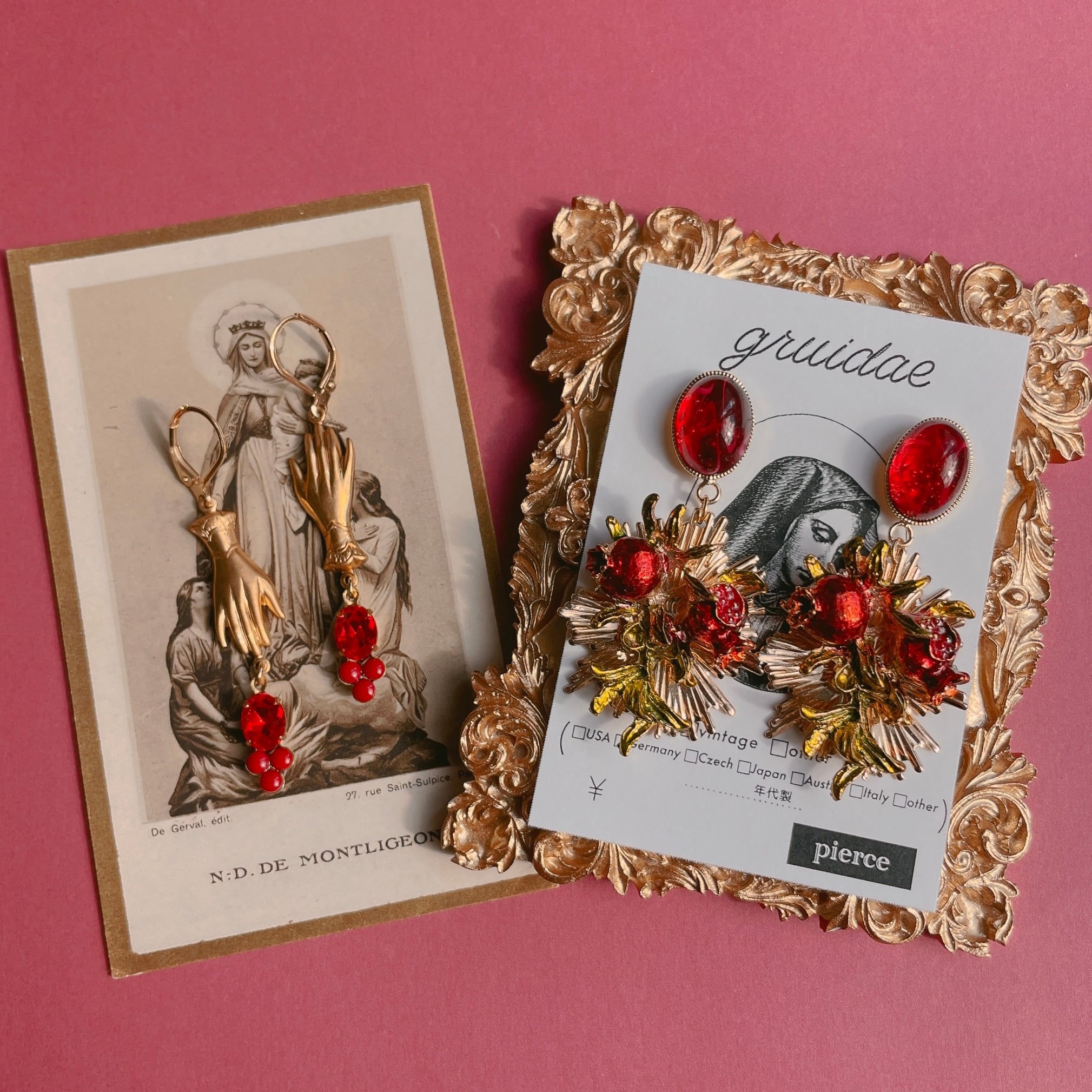 赤いガラスと後光さすザクロの耳飾り。