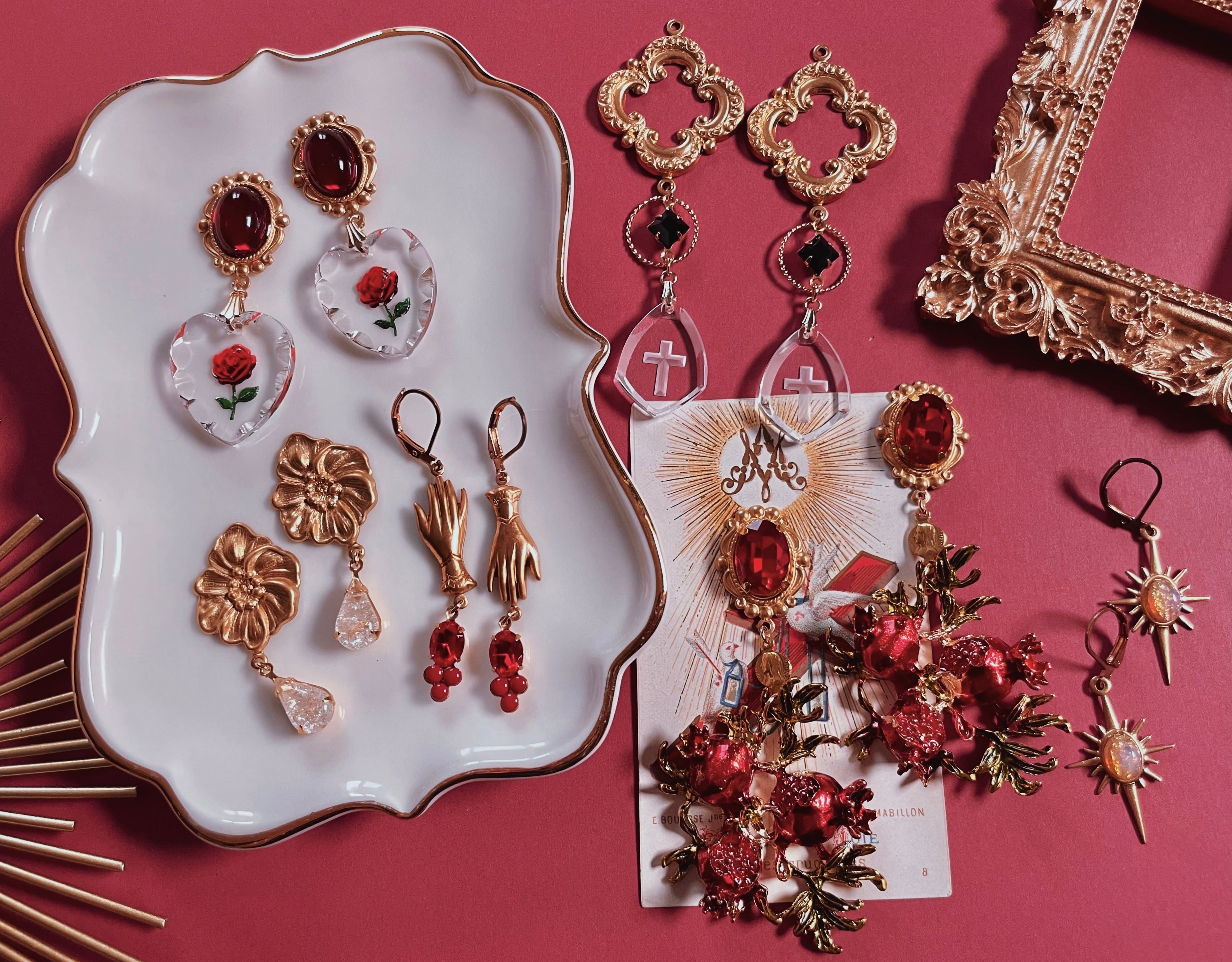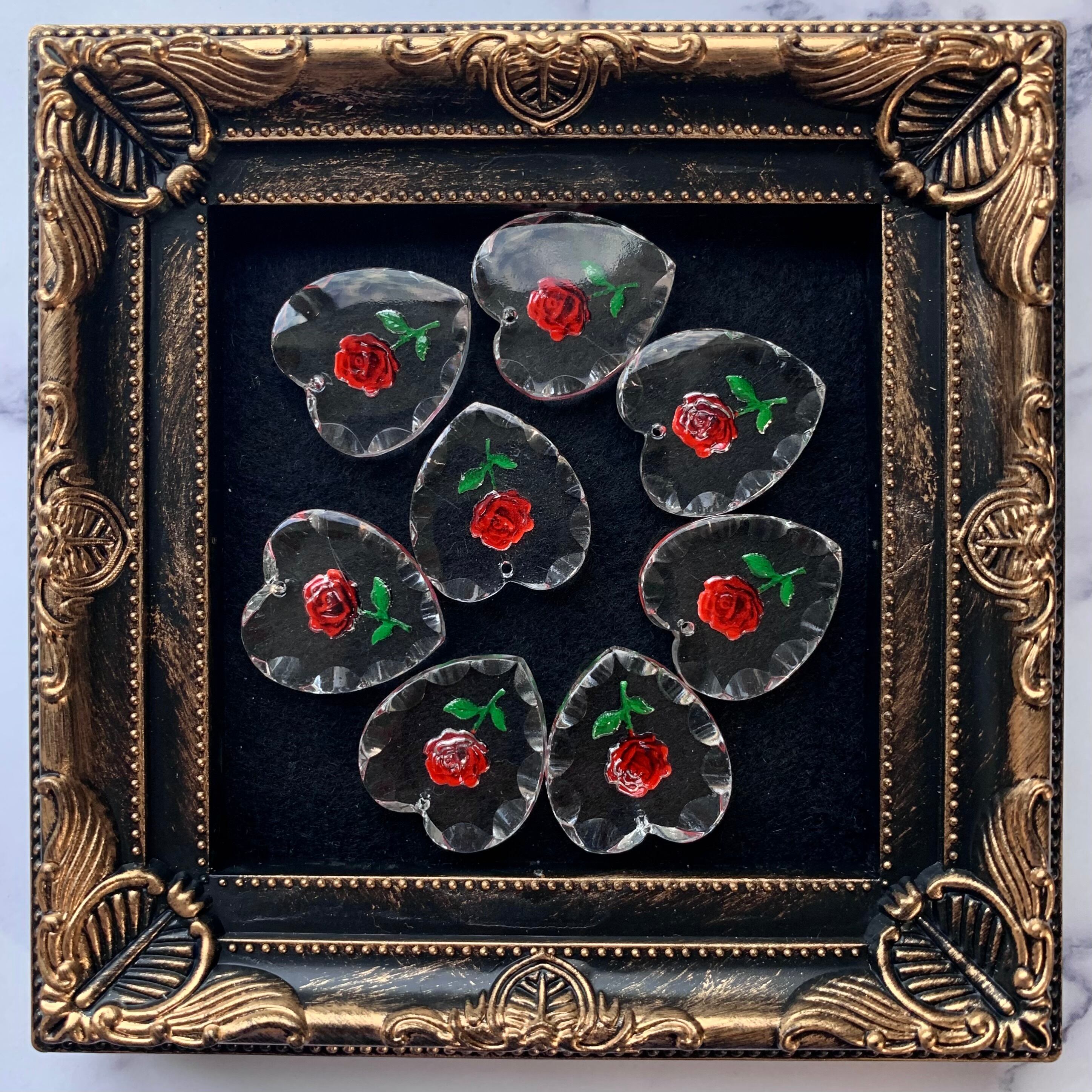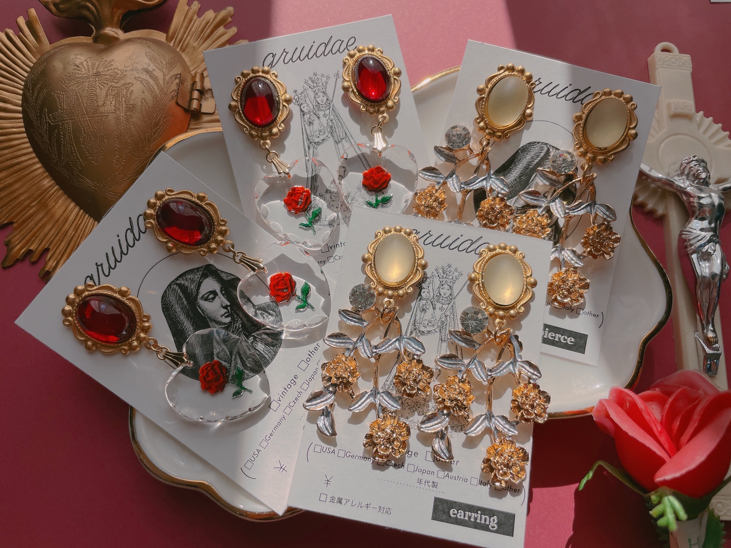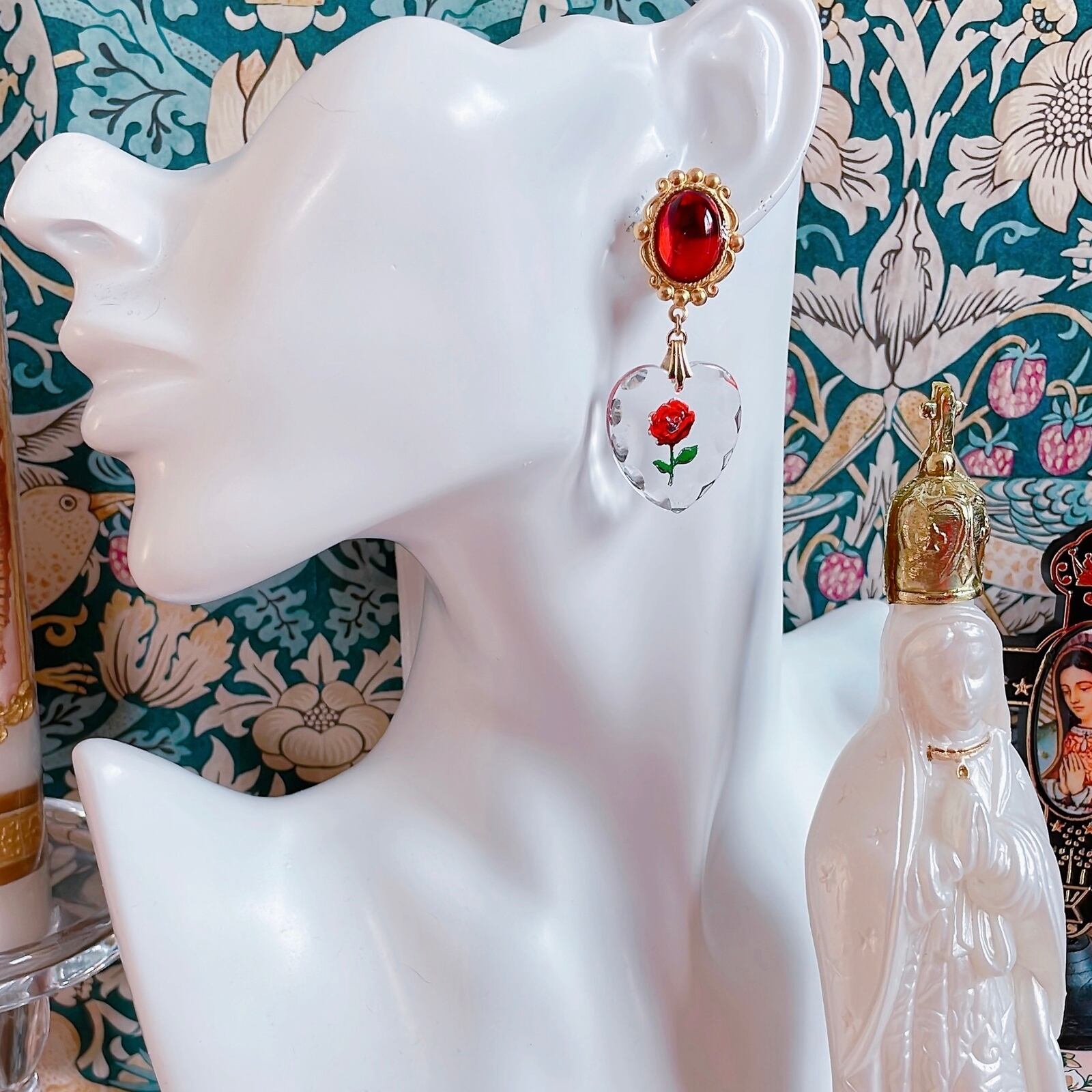 ハートのガラスに一輪のバラが描かれた美しいインタリオと鮮やかな赤いカボションの耳飾り。